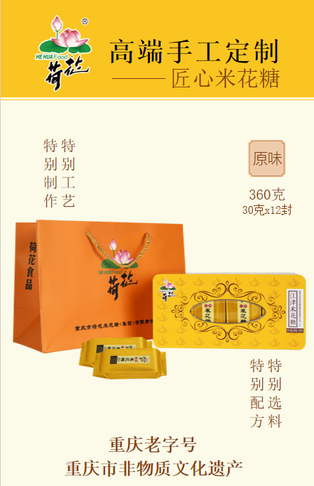 [size=0.8]经典款匠心米花糖是年味的不二之选,遵循传统工艺慢火细作,入口酥脆香甜不粘牙,既有江津米花糖的非遗传承底蕴,又带着老重庆的怀旧滋味 。无论是送给长辈回味童年,还是让晚辈感受传统年味,都能甜进心坎里,恰如春节的美好寓意——日子甜甜蜜蜜,生活步步高升。