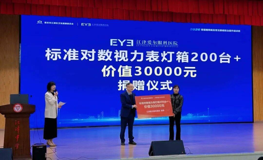 [size=0.8]江津爱尔眼科医院向基层医疗机构捐赠了200台标准对数视力灯箱,用于基层医疗机构专业的视力检查。这一举动不仅是对基层硬件设施的补充,更是推动优质医疗资源下沉、实现眼病“早发现、早干预”的具体举措。江津区卫健委副主任李兴莉、江津爱尔眼科医院院长刘承等领导共同上台见证了这一温暖时刻。